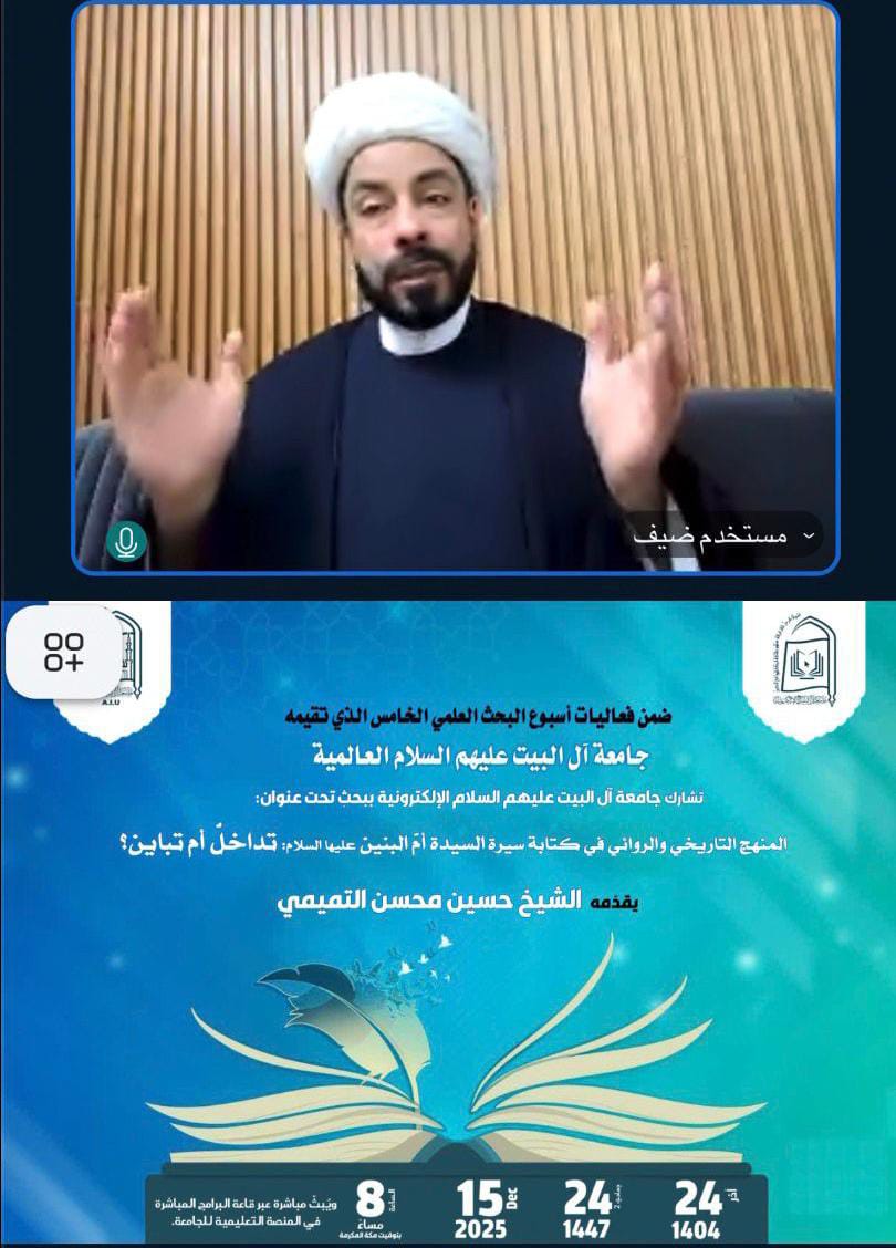تقدّم الباحث الدكتور الشيخ حسين التميمي بمشاركة علمية متخصصة ضمن أسبوع البحث العلمي الذي أقامته جامعة آل البيت (عليهم السلام) العالمية، وبمشاركة جامعة آل البيت (عليهم السلام) الإلكترونية، وذلك ببحثٍ علمي موسّع حمل عنوان «المنهج التاريخي والروائي في كتابة سيرة أم البنين (عليها السلام): تداخل أم تباين؟»، تناول فيه سيرة السيدة الجليلة أم البنين (عليها السلام) برؤية منهجية نقدية تجمع بين الدقة العلمية والبعد التحليلي المعاصر.وتوزّعت الدراسة على مبحثين رئيسين؛ خُصِّص المبحث الأول لبحث المنهج التاريخي في كتابة سيرة أم البنين (عليها السلام)، واشتمل على مطلبين، تناول الأول خصائص المنهج التاريخي في عرض السير الذاتية الإسلامية، من حيث تعريفه وأدوات التوثيق والتحقيق ومعايير تقييم الروايات التاريخية، مع إبراز مسلك المدرسة الأصولية المعاصرة، ولا سيما موقف السيد الخوئي (قدس سره) القائم على الصرامة السندية، ورؤية السيد السيستاني (دام ظله) التي تؤكد التفريق بين الرواية ذات الأثر الشرعي والرواية ذات البعد الوجداني. أما المطلب الثاني فقد عالج واقع المصادر التاريخية التي تناولت سيرة أم البنين (عليها السلام)، مبيّنًا محدودية النصوص الموثّقة واعتماد الكثير من المعطيات المتداولة على مصادر متأخرة أو روايات مرسلة.أما المبحث الثاني فجاء بعنوان المنهج الروائي في كتابة سيرة أم البنين (عليها السلام)، وضمّ مطلبين، ركّز الأول على مفهوم المنهج الروائي ووظيفته في تشكيل الذاكرة الدينية والوعي الجمعي، مع الاستناد إلى آراء عدد من المفكرين الشيعة المعاصرين، من بينهم الدكتور محمد حسين الصغير، والعلامة باقر شريف القرشي، والسيد جعفر مرتضى العاملي، الذين أكدوا أهمية توظيف الرواية بوصفها أداة ثقافية وتربوية لا مصدرًا تأسيسيًا للتاريخ. في حين تناول المطلب الثاني أوجه التداخل بين المنهجين التاريخي والروائي، وحدود هذا التداخل وآثاره المنهجية في كتابة السيرة.وخلص البحث إلى أن العلاقة بين المنهجين ليست علاقة تباين أو تعارض، بل هي تداخل تكاملي مشروط، يقتضي اعتماد منهج تركيبي ناقد يحفظ للمنهج التاريخي دقته العلمية، ويصون للمنهج الروائي دوره في التعبير عن الوجدان الديني والرمزية القيمية، من دون الخلط بين ما هو موثّق وما هو تعبيري. كما أكد البحث أن سيرة أم البنين (عليها السلام) تمثل نموذجًا رساليًا لا يمكن استيعابه إلا من خلال هذا الجمع المنهجي الواعي.وتأتي هذه المشاركة بوصفها إسهامًا علميًا نوعيًا في مجال الدراسات السيرية والمنهجية، وإضافة معرفية تعزّز من حضور الدراسات الأكاديمية المتخصصة في تراث أهل البيت (عليهم السلام)، ولا سيما ما يتصل بالسيرة النسوية ودورها في بناء الوعي الديني المعاصر.